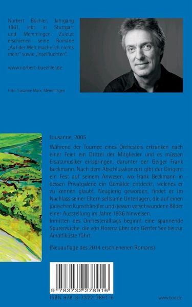Lausanne, 2005Während der Tournee eines Orchesters erkranken nach einer Feier ein Drittel der Mitglieder und es müssen Ersatzmusiker einspringen, darunter der Geiger Frank Beckmann. Nach dem Abschlusskonzert gibt der Dirigent ein Fest auf seinem Anwesen, wo Frank Beckmann in dessen Privatgalerie ein Gemälde entdeckt, das er zu kennen glaubt. Neugierig geworden, findet er im Nachlass seiner Eltern seltsame Unterlagen, die auf einen jüdischen Kunsthändler und dessen verschwundene Bilder einer Ausstellung im Jahre 1936 hinweisen. Inmitten des Orchesteralltags beginnt eine spannende Spurensuche, die von Florenz über den Genfer See bis zur Amalfiküste führt.(Neuauflage des 2014 erschienenen Romans)