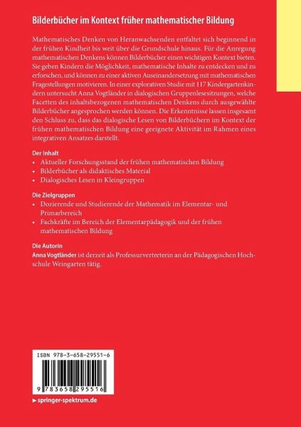Mathematisches Denken von Heranwachsenden entfaltet sich beginnend in der frühen Kindheit bis weit über die Grundschule hinaus. Für die Anregung mathematischen Denkens können Bilderbücher einen wichtigen Kontext bieten. Sie geben Kindern die Möglichkeit, mathematische Inhalte zu entdecken und zu erforschen, und können zu einer aktiven Auseinandersetzung mit mathematischen Fragestellungen motivieren. In einer explorativen Studie mit 117 Kindergartenkindern untersucht Anna Vogtländer in dialogischen Gruppenlesesitzungen, welche Facetten des inhaltsbezogenen mathematischen Denkens durch ausgewählte Bilderbücher angesprochen werden können. Die Erkenntnisse lassen insgesamt den Schluss zu, dass das dialogische Lesen von Bilderbüchern im Kontext der frühen mathematischen Bildung eine geeignete Aktivität im Rahmen eines integrativen Ansatzes darstellt.