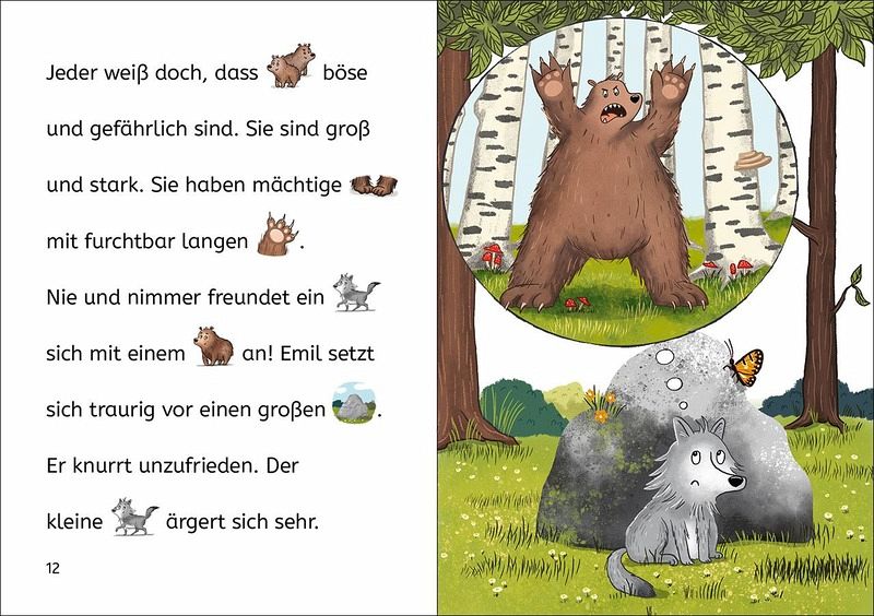 Was passiert, als die beiden sich bei einem großen Stein begegnen, das können Vorschulkinder anhand der kleinen Bilder im Text zusammen mit einem Erwachsenen schon bald selbst lesen.