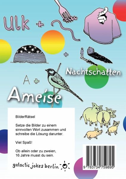 BilderRätsel, Gehirnjogging und Spaß. Dieses Buch enthält ein Bild von einer Frauenbrust und viele Schweine. Darum empfehle ich es erst ab 16 Jahren. Setze die Bilder zu einem sinnvollen Wort zusammen und schreibe die Lösung auf ein Stück Papier.Viel Spaß! Ob allein oder zu zweien, 16 Jahre musst du sein. Die Lösungen stehen auf den letzten Seiten. Aber! Nicht schummeln, sonst macht es keinen Spaß mehr. Am besten, einer kennt die Lösungen und bringt bei schwereren Rätseln den anderen auf die Fährte. Noch einmal, VIEL SPASS, wünscht euch die Zeichnerin Maren Roloff.