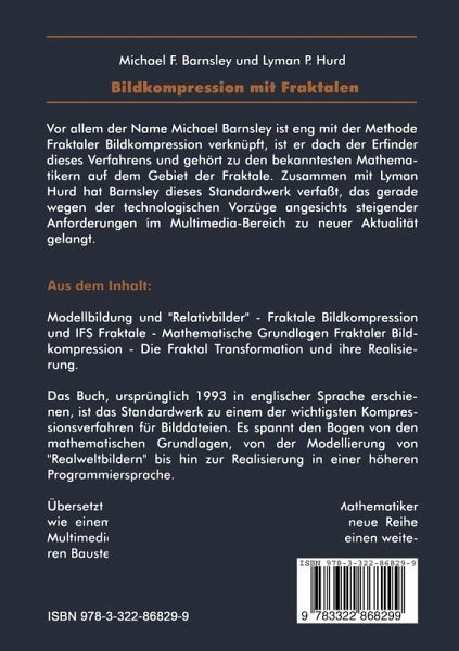 Das Buch, ursprünglich 1993 in englischer Sprache erschienen, ist das Standardwerk zu einem der wichtigsten Kompressionsverfahren für Bilddateien, geschrieben von den Erfindern Michael Barnsley und Lyman Hurd. Es spannt den Bogen von den mathematischen Grundlagen, von der Modellierung von "Realweltbildern" bis hin zur Realisierung in einer höheren Programmiersprache, gewinnt vor dem Hintergrund neuer Multimedia- und Speicheranforderungen hohe Aktualität. Übersetzt wurde das Werk sowohl von einem Mathematiker wie einem Informatiker. Das Werk erscheint in der neuen Reihe des Verlages Vieweg: Multimedia-Engineering.