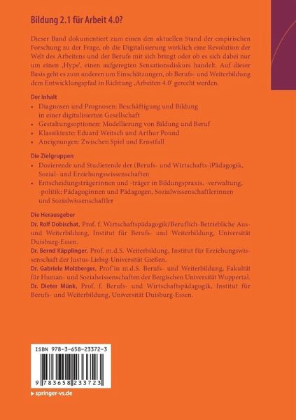 Dieser Band dokumentiert zum einen den aktuellen Stand der empirischen Forschung zu der Frage, ob die Digitalisierung wirklich eine Revolution der Welt des Arbeitens und der Berufe mit sich bringt oder ob es sich dabei nur um einen 'Hype', einen aufgeregten Sensationsdiskurs handelt. Auf dieser Basis geht es zum anderen um Einschätzungen, ob Berufs- und Weiterbildung dem Entwicklungspfad in Richtung 'Arbeiten 4.0' gerecht werden.