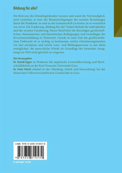 Bildung in Österreich als privates und öffentliches Gut im nationalen und internationalen Umfeld.- Erwachsenenbildung in Österreich: Finanzierung als Materialisierung von Politik.- Professionalisierung der ErwachsenenbildnerInnen als unabschließbarer Prozess.- Vom Bildungsbedarf zum Bildungswunsch: Kann die Erwachsenenbildung durch Interesse-Entwicklung nachhaltiges und eigenständiges Weiterlernen fördern?.- Bildungsberatung in der Erwachsenenbildung und ihre Wirkungen für das lebenslange Lernen.- Bildung als lebensverändernde Erfahrung?.- Erwachsenenbildung in bewegten Zeiten. Spannungsfelder einer "gerechten Bildung" im Kontext von Flucht und Migration .- Soziale Ungleichheit als (un)intendierter Outcome beruflicher Aus- und Weiterbildung.- Hochschulbildung zwischen nicht traditionellen Bildungswegen und lebenslangem Lernen in Österreich.- Erwachsenenbildung im Lebensraum - Bedeutung regionaler Ansätze im europäischen Kontext.- Digital gestütztes Lernen in der Erwachsenenbildung -wo liegt die Innovation?.- Möglichkeiten und Herausforderungen einer mediendidaktischen Gestaltung politischer Erwachsenenbildung.- Zum Nutzen von Volkshochschulbildung.- Von Phänomenen der (In-)Visibilisierung in der Weiterbildung am Beispiel entgrenzter Erwachsenenbildung in Kärnten.- Regionale Teilhabe und Bildung.
