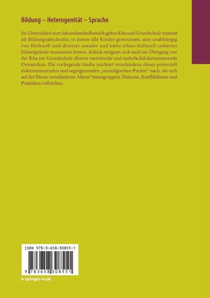 Im Unterschied zum Sekundarschulbereich gelten Kita und Grundschule zumeist als Bildungsabschnitte, in denen alle Kinder gemeinsam, also unabhängig von Herkunft und diverser sozialer und natio-ethno-kulturell codierter Hintergründe zusammen lernen. Jedoch ereignen sich auch im Übergang von der Kita zur Grundschule diverse rassistische und mehrfachdiskriminierende Dynamiken. Die vorliegende Studie zeichnet verschiedene dieser potenziell diskriminierenden und segregierenden "neuralgischen Punkte" nach, die sich auf der Ebene verschiedener Akteur_innengruppen, Diskurse, Konfliktlinien und Praktiken vollziehen.