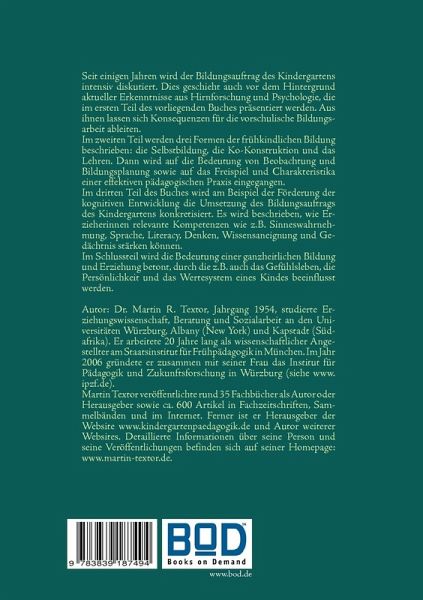 Seit einigen Jahren wird der Bildungsauftrag des Kindergartens intensiv diskutiert. Dies geschieht auch vor dem Hintergrund aktueller Erkenntnisse aus Hirnforschung und Psychologie, die im ersten Teil des vorliegenden Buches präsentiert werden. Aus ihnen lassen sich Konsequenzen für die vorschulische Bildungsarbeit ableiten.Im zweiten Teil werden drei Formen der frühkindlichen Bildung beschrieben: die Selbstbildung, die Ko-Konstruktion und das Lehren. Dann wird auf die Bedeutung von Beobachtung und Bildungsplanung sowie auf das Freispiel und Charakteristika einer effektiven pädagogischen Praxis eingegangen.Im dritten Teil des Buches wird am Beispiel der Förderung der kognitiven Entwicklung die Umsetzung des Bildungsauftrags des Kindergartens konkretisiert. Es wird beschrieben, wie Erzieherinnen relevante Kompetenzen wie z.B. Sinneswahrnehmung, Sprache, Literacy, Denken, Wissensaneignung und Gedächtnis stärken können. Ferner wird auf die mathematische, die naturwissenschaftliche und die informationstechnische Bildung eingegangen.Im Schlussteil wird die Bedeutung einer ganzheitlichen Bildung und Erziehung betont, durch die z.B. auch das Gefühlsleben, die Persönlichkeit und das Wertesystem eines Kindes beeinflusst werden.