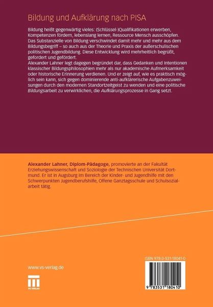 Bildung heißt gegenwärtig vieles: (Schlüssel-)Qualifikationen erwerben, Kompetenzen fördern, lebenslang lernen, Ressource Mensch ausschöpfen. Das Substanzielle von Bildung verschwindet damit mehr und mehr aus dem Bildungsbegriff - so auch aus der Theorie und Praxis der außerschulischen politischen Jugendbildung. Diese Entwicklung wird mehrheitlich begrüßt, gefordert und gefördert. Alexander Lahner legt dagegen begründet dar, dass Gedanken und Intentionen klassischer Bildungsphilosophien mehr als nur akademische Aufmerksamkeit oder historische Erinnerung verdienen. Und er zeigt auf, wie es praktisch möglich sein kann, sich gegen dominierende anti-aufklärerische Aufgabenzuweisungen durch den modernen Standortzeitgeist zu wenden und eine politische Bildungsarbeit zu verwirklichen, die Aufklärungsprozesse in Gang setzt.