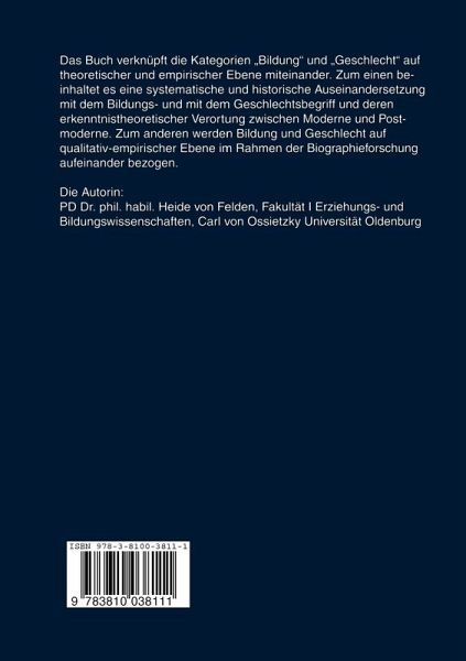 Das Buch verknüpft die Kategorien "Bildung" und "Geschlecht" auf theoretischer und empirischer Ebene miteinander. Zum einen beinhaltet es eine systematische und historische Auseinandersetzung mit dem Bildungs- und mit dem Geschlechtsbegriff und deren erkenntnistheoretischer Verortung zwischen Moderne und Postmoderne. Zum anderen werden Bildung und Geschlecht auf qualitativ-empirischer Ebene im Rahmen der Biographieforschung aufeinander bezogen.