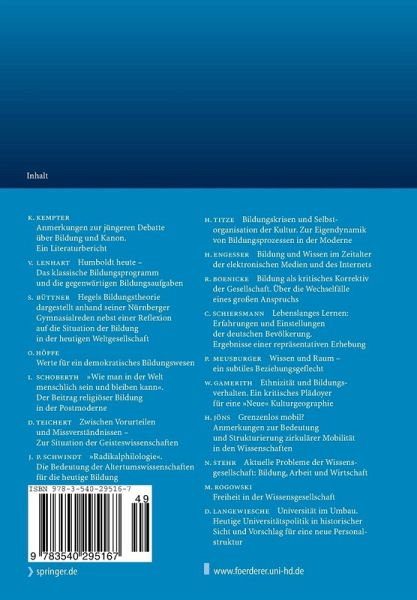 Der vorliegende Band reflektiert das Thema "Bildung und Wissensgesellschaft", das durch die PISA-Studie, die Diskussion über die Zukunft unseres rohstoffarmen Landes und die nicht zuletzt kulturell konfigurierten weltpolitischen Spannungen Aktualität und Bedeutung erlangte, auf eine umfassende und interdisziplinäre Weise.
