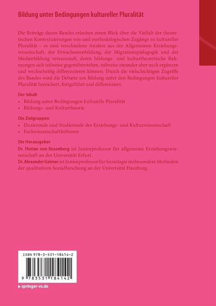 Die Beiträge dieses Bandes erlauben einen Blick über die Vielfalt der theoretischen Kontextuierungen von und methodologischen Zugänge zu kultureller Pluralität - es sind verschiedene Ansätze aus der Allgemeinen Erziehungs-wissenschaft, der Erwachsenenbildung, der Migrationspädagogik und der Medienbildung versammelt, deren bildungs- und kulturtheoretische Rahmungen sich teilweise gegenüberstehen, teilweise einander aber auch ergänzen und wechselseitig differenzieren können. Durch die vielschichtigen Zugriffe des Bandes wird die Debatte um Bildung unter den Bedingungen kultureller Pluralität bereichert, fortgeführt und differenziert.