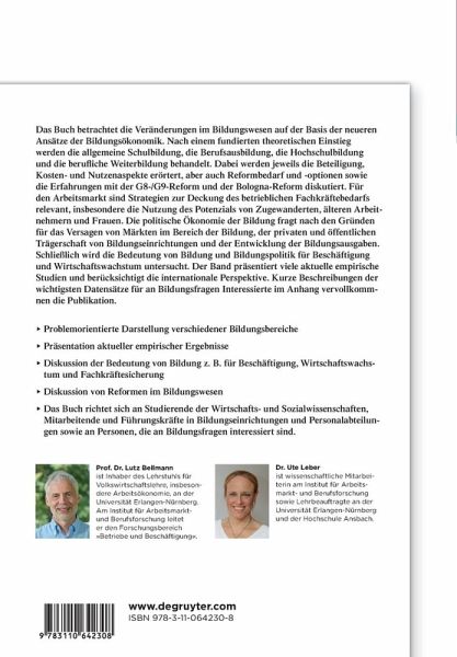 Das Buch betrachtet die Veränderungen im Bildungswesen auf der Basis der neueren Ansätze der Bildungsökonomik. Nach einem fundierten theoretischen Einstieg werden die allgemeine Schulbildung, die Berufsausbildung, die Hochschulbildung und die berufliche Weiterbildung behandelt. Dabei werden jeweils die Beteiligung, Kosten- und Nutzenaspekte erörtert, aber auch Reformbedarf und -optionen sowie die Erfahrungen mit der G8-/G9-Reform und der Bologna-Reform diskutiert. Für den Arbeitsmarkt sind Strategien zur Deckung des betrieblichen Fachkräftebedarfs relevant, insbesondere die Nutzung des Potenzials von Zugewanderten, älteren Arbeitnehmern und Frauen. Die politische Ökonomie der Bildung fragt nach den Gründen für das Versagen von Märkten im Bereich der Bildung, der privaten und öffentlichen Trägerschaft von Bildungseinrichtungen und der Entwicklung der Bildungsausgaben. Schließlich wird die Bedeutung von Bildung und Bildungspolitik für Beschäftigung und Wirtschaftswachstum untersucht. Der Band präsentiert viele aktuelle empirische Studien und berücksichtigt die internationale Perspektive. Kurze Beschreibungen der wichtigsten Datensätze für an Bildungsfragen Interessierte im Anhang vervollkommnen die Publikation.