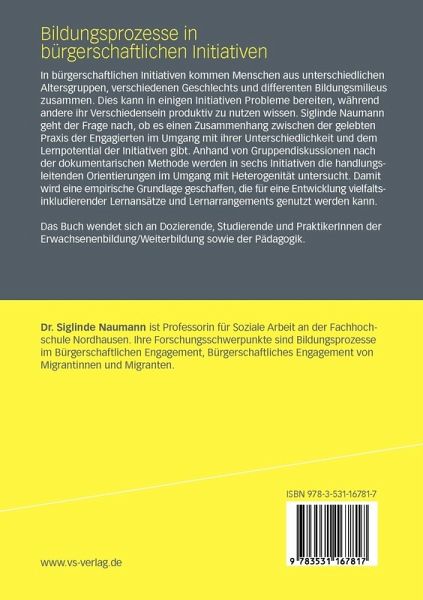 In bürgerschaftlichen Initiativen kommen Menschen aus unterschiedlichen Altersgruppen, verschiedenen Geschlechts und differenten Bildungsmilieus zusammen. Dies kann in einigen Initiativen Probleme bereiten, während andere ihr Verschiedensein produktiv zu nutzen wissen. Siglinde Naumann geht der Frage nach, ob es einen Zusammenhang zwischen der gelebten Praxis der Engagierten im Umgang mit ihrer Unterschiedlichkeit und dem Lernpotential der Initiativen gibt. Anhand von Gruppendiskussionen nach der dokumentarischen Methode werden in sechs Initiativen die handlungsleitenden Orientierungen im Umgang mit Heterogenität untersucht. Damit wird eine empirische Grundlage geschaffen, die für eine Entwicklung vielfaltsinkludierender Lernansätze und Lernarrangements genutzt werden kann.