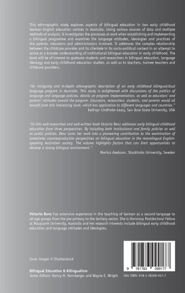 This ethnographic study explores aspects of institutional bilingual education in the early childhood sector. It provides contemporary research on the provision and practice of language teaching in the pre-primary sector and sheds light on the reception of bilingual education as well as attitudes towards it.