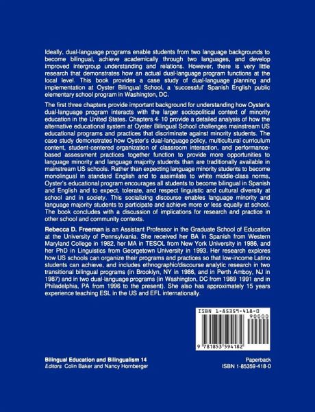 This book provides a case study of dual-language planning and implementation at a Spanish-English public elementary school program in Washington, DC. It demonstrates how this program provides more opportunities to language minority and language majority students than are traditionally available in mainstream US schools.
