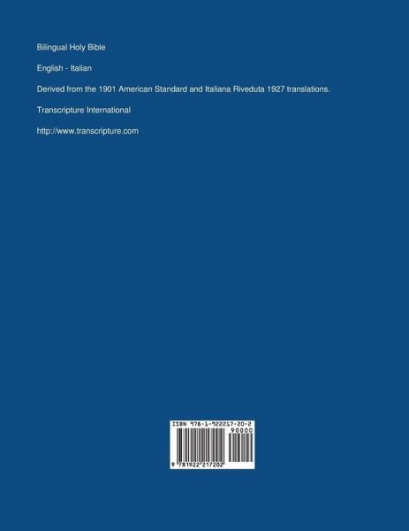 The "Bilingual Holy Bible, English - Italian" is derived from the 1901 English American Standard and 1927 Italian Riveduta Bible translations. Printed on white paper for easy reading, verses are paired in classical Biblical English and Italian so both translations can be followed sentence by sentence. Example verses: Genesis 1:1 "In the beginning God created the heavens and the earth." Genesi 1:1 "Nel principio Iddio creö i cieli e la terra." Psalms 23:4 "Yea, thou I walk through the valley of the shadow of death, I will fear no evil; for thou art with me; Thy rod and thy staff, they comfort me." Salmi 23:4 "Quand'anche camminassi nella valle dell'ombra della morte, io non temerei male alcuno, perche¿ tu sei meco; il tuo bastone e la tua verga son quelli che mi consolano." John 3:16 "For God so loved the world, that he gave his only begotten Son, that whosoever believeth on him should not perish, but have eternal life." Giovanni 3:16 "Poiche¿ Iddio ha tanto amato il mondo, che ha dato il suo unigenito Figliuolo, affinche¿ chiunque crede in lui non perisca, ma abbia vita eterna." Matthew 28:18-20 "18. And Jesus came to them and spake unto them, saying, All authority hath been given unto me in heaven and on earth. 19. Go ye therefore, and make disciples of all the nations, baptizing them into the name of the Father and of the Son and of the Holy Spirit: 20. teaching them to observe all things whatsoever I commanded you: and lo, I am with you always, even unto the end of the world." Matteo 28:18-20 "18. E Gesü, accostatosi, parlö loro, dicendo: Ogni potestä m'e¿ stata data in cielo e sulla terra. 19. Andate dunque, ammaestrate tutti i popoli, battezzandoli nel nome del Padre e del Figliuolo e dello Spirito Santo, 20. insegnando loro d'osservar tutte quante le cose che v'ho comandate. Ed ecco, io sono con voi tutti i giorni, sino alla fine dell'etä presente." Note that the texts have been edited to allow pairing of verses which can result in some verse numbers that differ from other Bibles. Contents Genesis - Genesi Exodus - Esodo Leviticus - Levitico Numbers - Numeri Deuteronomy - Deuteronomio Joshua - Giosuè Judges - Giudici Ruth - Rut I Samuel - I Samuele II Samuel - II Samuele I Kings - I Re II Kings - II Re I Chronicles - I Cronache II Chronicles - II Cronache Ezra - Esdra Nehemiah - Neemia Esther - Ester Job - Giobbe Psalms - Salmi Proverbs - Proverbi Ecclesiastes - Ecclesiaste Song of Solomon - Cantico dei Cantici Isaiah - Isaia Jeremiah - Geremia Lamentations - Lamentazioni Ezekiel - Ezechiele Daniel - Daniele Hosea - Osea Joel - Gioele Amos - Amos Obadiah - Abdia Jonah - Giona Micah - Michea Nahum - Nahum Habakkuk - Abacuc Zephaniah - Sofonia Haggai - Aggeo Zechariah - Zaccaria Malachi - Malachia Matthew - Matteo Mark - Marco Luke - Luca John - Giovanni Acts - Atti degli Apostoli Romans - Romani I Corinthians - I Corinzi II Corinthians - II Corinzi Galatians - Galati Ep