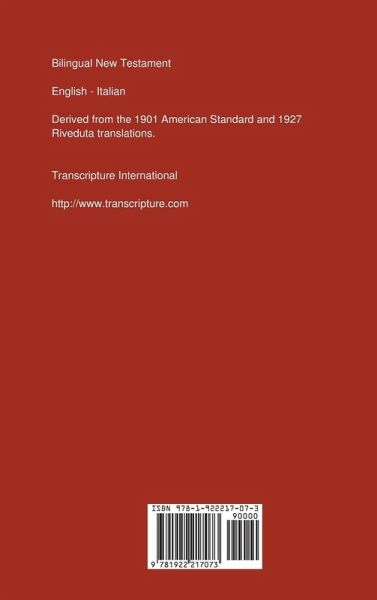 The Bilingual New Testament, English-Italian is derived from the 1901 English American Standard and Italian 1927 Riveduta Bible translations. Printed in 10-point text on white paper for easy reading, verses are paired in classical Biblical English and Italian so you can follow both translations sentence by sentence. Example verses: John 3:16 "For God so loved the world, that he gave his only begotten Son, that whosoever believeth on him should not perish, but have eternal life." Giovanni 3:16 "Poiche¿ Iddio ha tanto amato il mondo, che ha dato il suo unigenito Figliuolo, affinche¿ chiunque crede in lui non perisca, ma abbia vita eterna." Matthew 28:18-20 "18. And Jesus came to them and spake unto them, saying, All authority hath been given unto me in heaven and on earth. 19. Go ye therefore, and make disciples of all the nations, baptizing them into the name of the Father and of the Son and of the Holy Spirit: 20. teaching them to observe all things whatsoever I commanded you: and lo, I am with you always, even unto the end of the world." Matteo 28:18-20 "18. E Gesü, accostatosi, parlö loro, dicendo: Ogni potestä m'e¿ stata data in cielo e sulla terra. 19. Andate dunque, ammaestrate tutti i popoli, battezzandoli nel nome del Padre e del Figliuolo e dello Spirito Santo, 20. insegnando loro d'osservar tutte quante le cose che v'ho comandate. Ed ecco, io sono con voi tutti i giorni, sino alla fine dell'etä presente." Note that the texts have been edited to allow pairing of verses which can result in some verse numbers that differ from other Bibles. Contents Matthew - Matteo Mark - Marco Luke - Luca John - Giovanni Acts - Atti degli Apostoli Romans - Romani I Corinthians - I Corinzi II Corinthians - II Corinzi Galatians - Galati Ephesians - Efesini Philippians - Filippesi Colossians - Colossesi I Thessalonians - I Tessalonicesi II Thessalonians - II Tessalonicesi I Timothy - I Timoteo II Timothy - II Timoteo Titus - Tito Philemon - Filemone Hebrews - Ebrei James - Giacomo I Peter - I Pietro II Peter - II Pietro I John - I Giovanni II John - II Giovanni III John - III Giovanni Jude - Giuda Revelation - Apocalisse