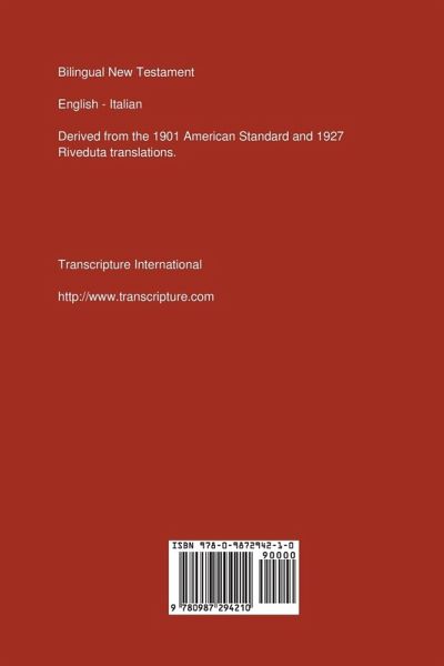 The Bilingual New Testament, English-Italian is derived from the 1901 English American Standard and Italian 1927 Riveduta Bible translations. Printed in 10-point text on white paper for easy reading, verses are paired in classical Biblical English and Italian so you can follow both translations sentence by sentence. Example verses: John 3:16 "For God so loved the world, that he gave his only begotten Son, that whosoever believeth on him should not perish, but have eternal life." Giovanni 3:16 "Poiche¿ Iddio ha tanto amato il mondo, che ha dato il suo unigenito Figliuolo, affinche¿ chiunque crede in lui non perisca, ma abbia vita eterna." Matthew 28:18-20 "18. And Jesus came to them and spake unto them, saying, All authority hath been given unto me in heaven and on earth. 19. Go ye therefore, and make disciples of all the nations, baptizing them into the name of the Father and of the Son and of the Holy Spirit: 20. teaching them to observe all things whatsoever I commanded you: and lo, I am with you always, even unto the end of the world." Matteo 28:18-20 "18. E Gesü, accostatosi, parlö loro, dicendo: Ogni potestä m'e¿ stata data in cielo e sulla terra. 19. Andate dunque, ammaestrate tutti i popoli, battezzandoli nel nome del Padre e del Figliuolo e dello Spirito Santo, 20. insegnando loro d'osservar tutte quante le cose che v'ho comandate. Ed ecco, io sono con voi tutti i giorni, sino alla fine dell'etä presente." Note that the texts have been edited to allow pairing of verses which can result in some verse numbers that differ from other Bibles. Contents Matthew - Matteo Mark - Marco Luke - Luca John - Giovanni Acts - Atti degli Apostoli Romans - Romani I Corinthians - I Corinzi II Corinthians - II Corinzi Galatians - Galati Ephesians - Efesini Philippians - Filippesi Colossians - Colossesi I Thessalonians - I Tessalonicesi II Thessalonians - II Tessalonicesi I Timothy - I Timoteo II Timothy - II Timoteo Titus - Tito Philemon - Filemone Hebrews - Ebrei James - Giacomo I Peter - I Pietro II Peter - II Pietro I John - I Giovanni II John - II Giovanni III John - III Giovanni Jude - Giuda Revelation - Apocalisse