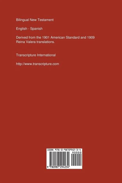 The Bilingual New Testament, English - Spanish is based on the 1901 American Standard Version and 1909 Biblia Reina Valera translations. Printed in 10-point text on white paper for easy reading, verses are paired in classical Biblical English and Spanish so you can follow both translations sentence by sentence. Example verses: John 3:16 For God so loved the world, that he gave his only begotten Son, that whosoever believeth on him should not perish, but have eternal life. Juan 3:16 Porque de tal manera amó Dios al mundo, que ha dado á su Hijo unigénito, para que todo aquel que en él cree, no se pierda, mas tenga vida eterna. Matthew 28:18-20 18. And Jesus came to them and spake unto them, saying, All authority hath been given unto me in heaven and on earth. 19. Go ye therefore, and make disciples of all the nations, baptizing them into the name of the Father and of the Son and of the Holy Spirit: 20. teaching them to observe all things whatsoever I commanded you: and lo, I am with you always, even unto the end of the world. Mateo 28:18-20 18. Y llegando Jesús, les habló, diciendo: Toda potestad me es dada en el cielo y en la tierra. 19. Por tanto, id, y doctrinad á todos los Gentiles, bautizándolos en el nombre del Padre, y del Hijo, y del Espíritu Santo: 20. Enseñándoles que guarden todas las cosas que os he mandado: y he aquí, yo estoy con vosotros todos los días, hasta el fin del mundo. Amén. Note that the texts have been edited to allow pairing of verses which can result in some verse numbers that differ from other Bibles. Contents: Matthew - Mateo Mark - Marcos Luke - Lucas John - Juan Acts - Hechos Romans - Romanos I Corinthians - I Corintios II Corinthians - II Corintios Galatians - Gálatas Ephesians - Efesios Philippians - Filipenses Colossians - Colosenses I Thessalonians - I Tesalonicenses II Thessalonians - II Tesalonicenses I Timothy - I Timoteo II Timothy - II Timoteo Titus - Tito Philemon - Filemón Hebrews - Hebreos James - Santiago I Peter - I Pedro II Peter - II Pedro I John - I Juan II John - II Juan III John - III Juan Jude - Judas Revelation - Apocalipsis