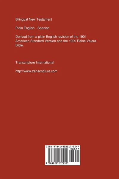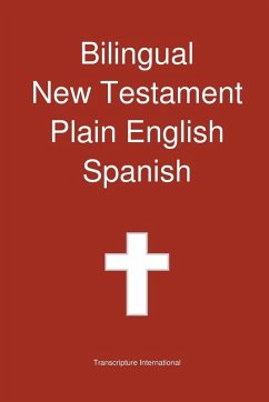 The "Bilingual New Testament, Plain English - Spanish" is derived from a plain English adaptation of the 1901 English American Standard Bible and the 1909 Reina Valera Bible. Printed in 10-point text on white paper for easy reading, verses are paired in plain English and Spanish so you can follow both translations sentence by sentence. Example verses: John 3:16 "For God so loved the world, that he gave his one and only Son, that whoever believes in him should not perish, but have eternal life." Juan 3:16 "Porque de tal manera amö Dios al mundo, que ha dado ä su Hijo unige¿nito, para que todo aquel que en e¿l cree, no se pierda, mas tenga vida eterna." Matthew 28:18-20 "18. Jesus came to them and spoke to them, saying, 'All authority has been given to me in heaven and on earth. 19. Go, and make disciples of all nations, baptizing them in the name of the Father and of the Son and of the Holy Spirit, 20. teaching them to observe all things which I commanded you. Behold, I am with you always, even to the end of the age.' Amen." Mateo 28:18-20 "18. Y llegando Jesüs, les hablö, diciendo: Toda potestad me es dada en el cielo y en la tierra. 19. Por tanto, id, y doctrinad ä todos los Gentiles, bautizändolos en el nombre del Padre, y del Hijo, y del Espi¿ritu Santo: 20. Ensen¿ändoles que guarden todas las cosas que os he mandado: y he aqui¿, yo estoy con vosotros todos los di¿as, hasta el fin del mundo. Ame¿n." Note that the texts have been edited to allow pairing of verses which can result in some verse numbers that differ from other Bibles. Contents: Matthew - Mateo Mark - Marcos Luke - Lucas John - Juan Acts - Hechos Romans - Romanos I Corinthians - I Corintios II Corinthians - II Corintios Galatians - Gálatas Ephesians - Efesios Philippians - Filipenses Colossians - Colosenses I Thessalonians - I Tesalonicenses II Thessalonians - II Tesalonicenses I Timothy - I Timoteo II Timothy - II Timoteo Titus - Tito Philemon - Filemón Hebrews - Hebreos James - Santiago I Peter - I Pedro II Peter - II Pedro I John - I Juan II John - II Juan III John - III Juan Jude - Judas Revelation - Apocalipsis