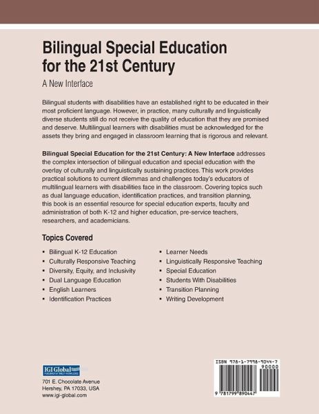 Bilingual students with disabilities have an established right to be educated in their most proficient language. However, in practice, many culturally and linguistically diverse students still do not receive the quality of education that they are promised and deserve. Multilingual learners with disabilities must be acknowledged for the assets they bring and engaged in classroom learning that is rigorous and relevant. Bilingual Special Education for the 21st Century: A New Interface addresses the complex intersection of bilingual education and special education with the overlay of culturally and linguistically sustaining practices. This work provides practical solutions to current dilemmas and challenges today's educators of multilingual learners with disabilities face in the classroom. Covering topics such as dual language education, identification practices, and transition planning, this book is an essential resource for special education experts, faculty and administration of both K-12 and higher education, pre-service teachers, researchers, and academicians.