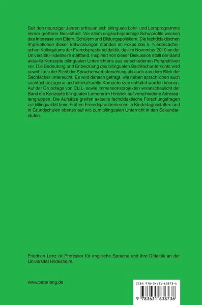 Seit den neunziger Jahren erfreuen sich bilinguale Lehr- und Lernprogramme immer größerer Beliebtheit. Vor allem englischsprachige Schulprofile wecken das Interesse von Eltern, Schülern und Bildungspolitikern. Die fachdidaktischen Implikationen dieser Entwicklungen standen im Fokus des 5. Niedersächsischen Kolloquiums der Fremdsprachendidaktik, das im November 2010 an der Universität Hildesheim stattfand. Inspiriert von dieser Diskussion stellt der Band aktuelle Konzepte bilingualen Unterrichtens aus verschiedenen Perspektiven vor. Die Bedeutung und Entwicklung des bilingualen Sachfachunterrichts wird sowohl aus der Sicht der Spracherwerbsforschung als auch aus dem Blick der Sachfächer untersucht. Es wird danach gefragt, wie neben sprachlichen auch sachfachbezogene und interkulturelle Kompetenzen entfaltet werden können. Auf der Grundlage von CLIL- sowie Immersionsprojekten veranschaulicht der Band die Konzepte bilingualen Lernens im Hinblick auf verschiedene Adressatengruppen. Die Aufsätze greifen aktuelle fachdidaktische Forschungsfragen zur Bilingualität beim Frühen Fremdsprachenlernen in Kindertagesstätten und in Grundschulen ebenso auf wie zum bilingualen Unterricht in den Sekundarstufen.