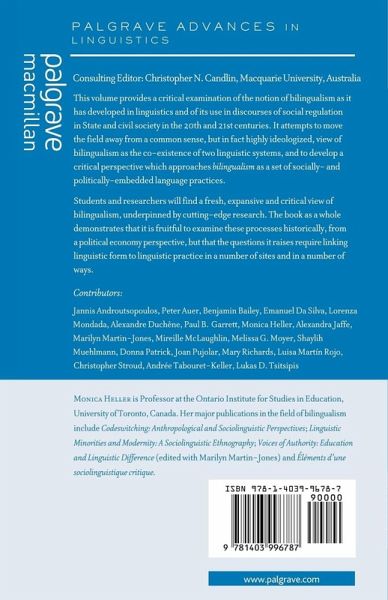 This volume provides a critical examination of the notion of bilingualism as it has developed in linguistics and of its use in discourses of social regulation in State and civil society in the 20th and 21st centuries. It attempts to move the field away from a common sense , but in fact highly ideologized, view of bilingualism as the co-existence of two linguistic systems, and to develop a critical perspective which approaches bilingualism in a way that allows for a better grasp of the ways in which language practices and socially and politically embedded. Students and researchers will find a fresh, expansive and critical view of bilingualism, underpinned by cutting-edge research, The book as a whole demonstrates that it is fruitful to examine these processes historically, from a political economy perspective, but that the questions it raises require linking linguistic form to linguistic practice in a number of sites and in a number of ways.