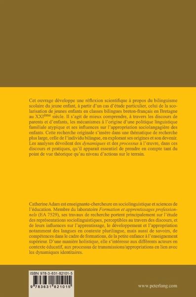 Cet ouvrage développe une réflexion scientifique à propos du bilinguisme scolaire du jeune enfant, à partir d'un cas d'étude particulier, celui de la scolarisation de jeunes enfants en classes bilingues breton-français en Bretagne au XXIème siècle. Il s'agit de mieux comprendre, à travers les discours de parents et d'enfants, les mécanismes à l'origine d'une politique linguistique familiale atypique et ses influences sur l'appropriation sociolangagière des enfants. Cette recherche originale s'insère dans une thématique de recherche plus large, celle de l'individu bilingue, en explorant ses origines et son devenir. Les analyses dévoilent des dynamiques et des processus à l'oeuvre, dans ces discours et pratiques, qu'il apparait essentiel de prendre en compte tant du point de vue théorique qu'au niveau d'actions sur le terrain.