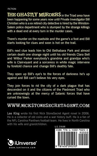 The ghastly murders in the Triad area have been happening for some years now until Private Investigator Bill Christian who is a ex retired city detective is hired by the Winston- Salem police department who is stumped by the strange killings with a dead end at every turn in the murder cases. There's murder on the roadside and the game's a foot and Bill starts looking for clues and soon is hot on the trail. Bill's next clue leads him to Old Bethabara Park and almost certain death one strange night until his old friends Clara Bell and Wilbur Parker everybody's grandma and grandpa who's wife is Clairvoyant and a sorceress in white magic intervene by foretold chance and change Bill's deathly fate. They open up Bill's eye's to the forces of darkness he's up against and Bill can't believe his very eyes. They join forces to rid the city of a dark plague that has descended on it and the citizens of the Piedmont Triad who are unknowingly at the mercy of Satanic forces that have cursed the town. www.nickstonesecretagent.com