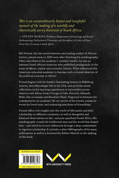 The first biography of an eminent historian of South Africa Bill Freund, the late social historian and leading analyst of African history, passed away in 2020 soon after finishing his autobiography. Often described as the academy's 'outsider insider', he was an eminent South African historian who published prodigiously in the areas of labour, capital and economic history. What influenced this American-educated academic to become such an astute and trusted observer of the political economy in Africa? We follow Bill's intellectual journey from a modest Jewish home in Chicago in the 1950s to the Universities of Chicago, Yale, Ahmadu Bello University in Nigeria and Dar-es-Salaam, Tanzania, and finally to a permanent teaching position at the University of KwaZulu-Natal in Durban, South Africa. Peppered in between the commentaries on academic life are stories of his travels, poems he wrote for loved ones, and endearing anecdotes of friendships that shaped his life. As an 'outsider', both in the United States and abroad, he is able to offer rich insights into the world of Africanists and their scholarship on different continents. His thoughtful and balanced observations on late- and post-apartheid South Africa are especially interesting and refreshing. This posthumously published autobiography will give deeper insight into this unusual man and the world that shaped him - and which he in turn influenced through a deep commitment to rigorous scholarship. It includes a select bibliography of Bill Freund's many publications as well as a foreword by Robert Morrell on the making of this autobiography.