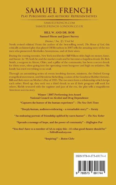 Drama / 3m, 3f (w/doubling) / Unit set Newly revised edition! From the author of the best-selling novel, The House of God, this critically acclaimed version which played Off-Broadway in 2007, tells the amazing story of the two men who pioneered Alcoholics Anonymous, and of their wives, who founded Al Anon. During the roaring '20s, New York stockbroker Bill Wilson rides high on money, fame, and booze. In '29, both he and the market crash and he becomes a hopeless drunk. Dr. Bob Smith, a surgeon