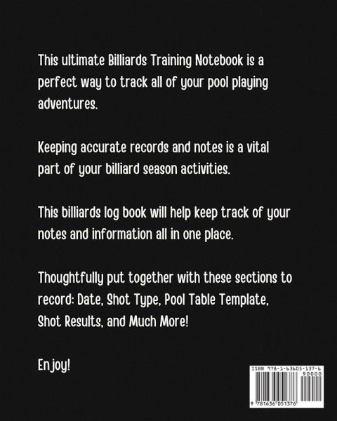 How to use this Billiards Training Log Book: 8 X 10 Inches 110 Pages This useful Billiards Training Log Book is a must-have for anyone that loves to record their pool playing activities! You will love this easy to use billiards training log book to track and record all pool playing activities. Each interior page includes space to record & track the following: Shot Type - Record the type of pool shot, break, the plants, the double, bank shots, and much more. Pool Table Template - Use this template to visualize and map out your next move. Shot Results - Stay on task by recording the results of shots taken. If you are new to playing pool or have been at it for a while, this billiards training is a must have! Can make a great useful gift for anyone that loves to play pool! Have Fun!