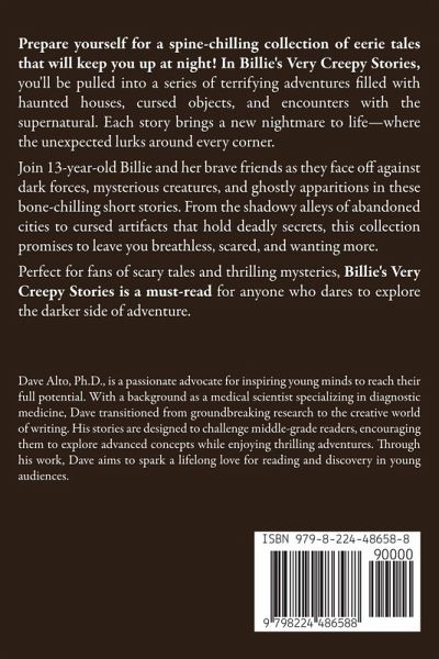Prepare yourself for a spine-chilling collection of eerie tales that will keep you up at night! In Billie's Very Creepy Stories, you'll be pulled into a series of terrifying adventures filled with haunted houses, cursed objects, and encounters with the supernatural. Each story brings a new nightmare to life-where the unexpected lurks around every corner. Join 13-year-old Billie and her brave friends as they face off against dark forces, mysterious creatures, and ghostly apparitions in these bone-chilling short stories. From the shadowy alleys of abandoned cities to cursed artifacts that hold deadly secrets, this collection promises to leave you breathless, scared, and wanting more. Perfect for fans of scary tales and thrilling mysteries, Billie's Very Creepy Stories is a must-read for anyone who dares to explore the darker side of adventure.
