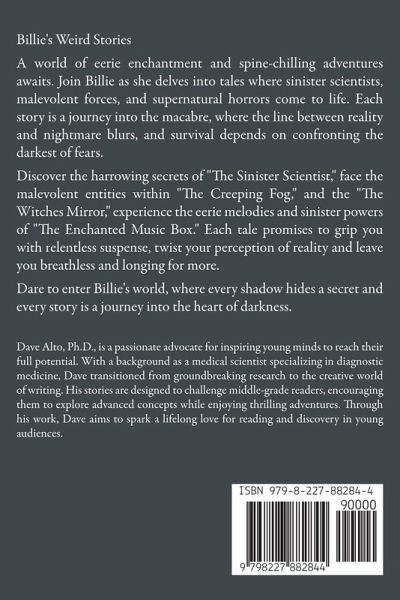 Billie's Weird Stories A world of eerie enchantment and spine-chilling adventures awaits. Join Billie as she delves into tales where sinister scientists, malevolent forces, and supernatural horrors come to life. Each story is a journey into the macabre, where the line between reality and nightmare blurs, and survival depends on confronting the darkest of fears. Discover the harrowing secrets of "The Sinister Scientist," face the malevolent entities within "The Creeping Fog," and uncover the dark truths hidden in "The Witches Mirror," experience the eerie melodies and sinister powers of "The Enchanted Music Box." Each tale promises the grip you with relentless suspense, twist your perception of reality and leave you breathless and longing for more. Dare to enter Billie's world, where every shadow hides a secret and every story is a journey into the heart of darkness.