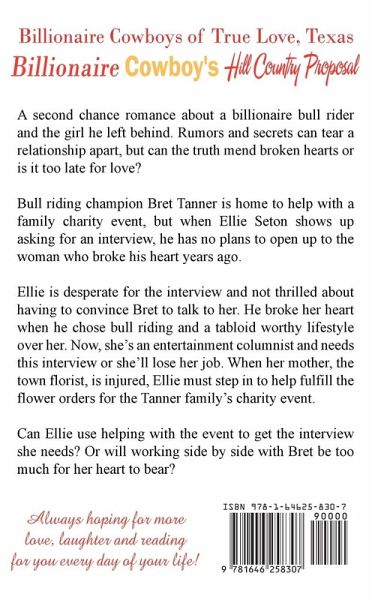 A second chance romance about a billionaire bull rider and the girl he left behind. Rumors and secrets can tear a relationship apart, but can the truth mend broken hearts or is it too late for love? Bull riding champion Bret Tanner is home to help with a family charity event, but when Ellie Seton shows up asking for an interview, he has no plans to open up to the woman who broke his heart years ago. Ellie is desperate for the interview and not thrilled about having to convince Bret to talk to her. He broke her heart when he chose bull riding and a tabloid worthy lifestyle over her. Now, she's an entertainment columnist and needs this interview or she'll lose her job. When her mother, the town florist, is injured, Ellie must step in to help fulfill the flower orders for the Tanner family's charity event. Can Ellie use helping with the event to get the interview she needs? Or will working side by side with Bret be too much for her heart to bear?