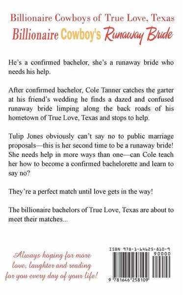 He's a confirmed bachelor, she's a runaway bride who needs his help. After confirmed bachelor, Cole Tanner catches the garter at his friend's wedding he finds a dazed and confused runaway bride limping along the back roads of his hometown of True Love, Texas and stops to help. Tulip Jones obviously can't say no to public marriage proposals-this is her second time to be a runaway bride! She needs help in more ways than one-can Cole teach her how to become a confirmed bachelorette and learn to say no? They're a perfect match until love gets in the way! The billionaire bachelors of True Love, Texas are about to meet their matches... Pre-Order Today or if you're in Kindle Unlimited add it to your wish list.