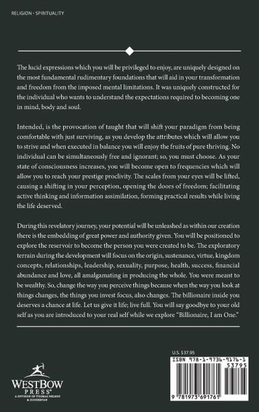 The lucid expressions which you will be privileged to enjoy, are uniquely designed on the most fundamental rudimentary foundations that will aid in your transformation and freedom from the imposed mental limitations. It was uniquely constructed for the individual who wants to understand the expectations required to becoming one in mind, body and soul. Intended, is the provocation of taught that will shift your paradigm from being comfortable with just surviving, as you develop the attributes which will allow you to strive and when executed in balance you will enjoy the fruits of pure thriving. No individual can be simultaneously free and ignorant; so, you must choose. As your state of consciousness increases, you will become open to frequencies which will allow you to reach your prestige proclivity. The scales from your eyes will be lifted, causing a shifting in your perception, opening the doors of freedom; facilitating active thinking and information assimilation, forming practical results while living the life deserved. During this revelatory journey, your potential will be unleashed as within our creation there is the embedding of great power and authority given. You will be positioned to explore the reservoir to become the person you were created to be. The exploratory terrain during the development will focus on the origin, sustenance, virtue, kingdom concepts, relationships, leadership, sexuality, purpose, health, success, financial abundance and love, all amalgamating in producing the whole. You were meant to be wealthy. So, change the way you perceive things because when the way you look at things changes, the things you invest focus, also changes. The billionaire inside you deserves a chance at life. Let us give it life; live full. You will say goodbye to your old self as you are introduced to your real self while we explore "Billionaire, I am One."