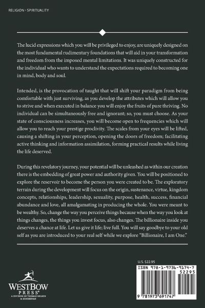 The lucid expressions which you will be privileged to enjoy, are uniquely designed on the most fundamental rudimentary foundations that will aid in your transformation and freedom from the imposed mental limitations. It was uniquely constructed for the individual who wants to understand the expectations required to becoming one in mind, body and soul. Intended, is the provocation of taught that will shift your paradigm from being comfortable with just surviving, as you develop the attributes which will allow you to strive and when executed in balance you will enjoy the fruits of pure thriving. No individual can be simultaneously free and ignorant; so, you must choose. As your state of consciousness increases, you will become open to frequencies which will allow you to reach your prestige proclivity. The scales from your eyes will be lifted, causing a shifting in your perception, opening the doors of freedom; facilitating active thinking and information assimilation, forming practical results while living the life deserved. During this revelatory journey, your potential will be unleashed as within our creation there is the embedding of great power and authority given. You will be positioned to explore the reservoir to become the person you were created to be. The exploratory terrain during the development will focus on the origin, sustenance, virtue, kingdom concepts, relationships, leadership, sexuality, purpose, health, success, financial abundance and love, all amalgamating in producing the whole. You were meant to be wealthy. So, change the way you perceive things because when the way you look at things changes, the things you invest focus, also changes. The billionaire inside you deserves a chance at life. Let us give it life; live full. You will say goodbye to your old self as you are introduced to your real self while we explore "Billionaire, I am One."
