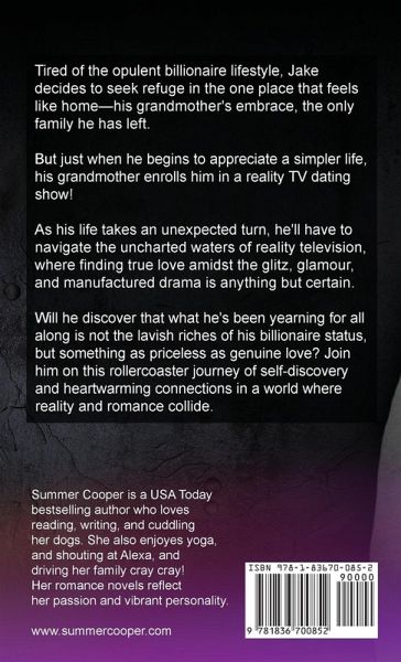 Enjoy this steamy match-making billionaire romance by USA Today Bestselling contemporary romance author Summer Cooper! Tired of the opulent billionaire lifestyle and aching for something more genuine, Jake decides to seek refuge in the one place that feels like home-his grandmother's embrace, the only family he has left. But just when the billionaire begins to appreciate a simpler life, his beloved grandmother drops a bombshell that shatters his newfound peace. She's determined to steer him toward a different path, one that leads to love, authenticity, and maybe a touch of chaos-she's enrolled him in a reality TV dating show! As his life takes an unexpected turn, he'll have to navigate the uncharted waters of reality television, where finding true love amidst the glitz, glamour, and manufactured drama is anything but certain. Will he discover that what he's been yearning for all along is not the lavish riches of his billionaire status, but something as priceless as genuine love? Join him on this rollercoaster journey of self-discovery and heartwarming connections in a world where reality and romance collide. This is an adult only steamy contemporary romance, appealing to readers who love fated mates, billionaire romance and sizzling hot romances with a twist. Perfect for fans of Julia Kent, Meghan Quinn, Marni Mann, Louise Bay and Ava Harrison.