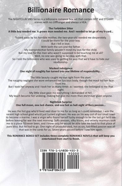 These Billionaires Will Bring You to Your Knees The Forbidden Sitter A little boy needed me. A grown man needed me. And I needed to let go of my V-card... Tossed away by his horrible mother, the two-year-old needed me desperately. I could be there for the poor boy. But I fell in love with both the son and the father. My overprotective family wouldn't mind my love for the child. But my love for the man who wasn't supposed to be touching me at all? Well, no one was going to be okay with that. So I told the billionaire who was used to getting his way that we'd have to hide our relationship. Keep the steamy encounters a secret. I found out billionaires do not like to be kept hidden. So how long would I get to feel his phenomenal touch before we had to end it all? Masked Indulgence One night of naughty fun turned into one lifetime of responsibility... The little beauty caught my eye right from the start. The naughty negligee she wore enhanced her luscious body, though the mask hid her face from me. But I took her anyway and I took her as many times as I wanted; she belonged to me that night. My little slave gave me everything I demanded of her. My touch became her undoing, making her give me more than she'd ever given anyone. Nightclub Surprise One full moon, one last chance, and one hot as hell night of fiery passion... He was the hot guy who'd lived next door to me for as long as I could remember. I was the recent high school grad who'd just turned eighteen. He was on his way out of our small town to become a marine. I was a virgin who found herself lucky enough to be the last girl he'd see before leaving for war the next morning. Soft caresses, silky kisses, and velvety murmurs took me to a place I'd never been, and I knew only he would be able take me back to that place of pure bliss. But he had to go. One night of unadulterated, hot as sin, lust-filled passion was all that was in the cards for us. Seven years passed before I saw him again. ¿¿Billionaire Romance: Nightclub Sins Box Set contains HOT and STEAMY scenes with no cliffhanger and always a HEA.