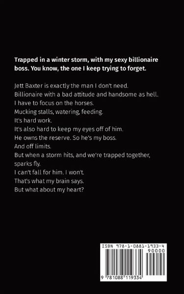 Trapped in a winter storm, with my sexy billionaire boss. You know, the one I keep trying to forget. Jett Baxter is exactly the man I don't need. Billionaire with a bad attitude and handsome as hell. I have to focus on the horses. Mucking stalls, watering, feeding. It's hard work. It's also hard to keep my eyes off of him. He owns the reserve. So he's my boss. And off limits. But when a storm hits, and we're trapped together, sparks fly. I can't fall for him. I won't. That's what my brain says. But what about my heart? This is a 20K word (about a 120 pages) short read / novella. No Angst. Sweet & Steamy with explicit Scenes. Enemies to Lovers. Boss/Employee.