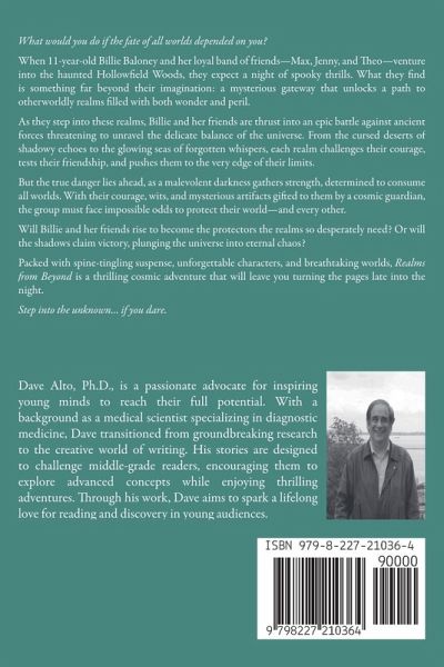 What would you do if the fate of all worlds depended on you? When 11-year-old Billie Baloney and her loyal band of friends-Max, Jenny, and Theo-venture into the haunted Hollowfield Woods, they expect a night of spooky thrills. What they find is something far beyond their imagination: a mysterious gateway that unlocks a path to otherworldly realms filled with both wonder and peril. As they step into these realms, Billie and her friends are thrust into an epic battle against ancient forces threatening to unravel the delicate balance of the universe. From the cursed deserts of shadowy echoes to the glowing seas of forgotten whispers, each realm challenges their courage, tests their friendship, and pushes them to the very edge of their limits. But the true danger lies ahead, as a malevolent darkness gathers strength, determined to consume all worlds. With their courage, wits, and mysterious artifacts gifted to them by a cosmic guardian, the group must face impossible odds to protect their world-and every other. Will Billie and her friends rise to become the protectors of the realms so desperately needed? Or will the shadows claim victory, plunging the universe into eternal chaos? Packed with spine-tingling suspense, unforgettable characters, and breathtaking worlds, Realms from Beyond is a thrilling cosmic adventure that will leave you turning the pages late into the night. Step into the unknown... if you dare.
