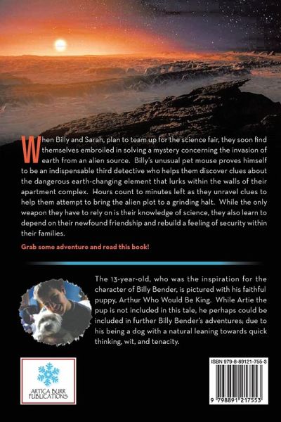 When Billy and Sarah, plan to team up for the science fair, they soon find themselves embroiled in solving a mystery concerning the invasion of earth from an alien source. Billy's unusual pet mouse proves himself to be an indispensable third detective who helps them discover clues about the dangerous earth changing element that lurks within the walls of their apartment complex. Hours count to minutes left as they unravel clues to help them attempt to bring the alien plot to a grinding halt. While the only weapon they have to rely on is their knowledge of science, they also learn to depend on their newfound friendship and rebuild a feeling of security within their families. Grab some adventure and read this book!