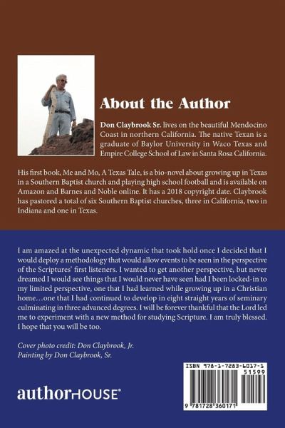 I am amazed at the unexpected dynamic that took hold once I decided that I would deploy a methodology that would allow events to be seen in the perspective of the Scriptures' first listeners. I wanted to get another perspective, but never dreamed I would see things that I would never have seen had I been locked-in to my limited perspective, one that I had learned while growing up in a Christian home...one that I had continued to develop in eight straight years of seminary culminating in three advanced degrees. I will be forever thankful that the Lord led me to experiment with a new method for studying Scripture. I am truly blessed. I hope that you will be too. Cover photo credit: Don Claybrook, Jr. Painting by Don Claybrook, Sr.