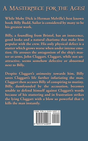 While Moby Dick is Herman Melville’s best known book Billy Budd, Sailor is considered by many to be his greatest work. Billy, a foundling from Bristol, has an innocence, good looks and a natural charisma that make him popular with the crew. His only physical defect is a stutter which grows worse when under intense emotion. He arouses the antagonism of the ship’s master-at-arms, John Claggart. Claggart, while not unattractive, seems somehow defective or abnormal next to Billy. Despite Claggart’s animosity towards him, Billy saves Claggart’s life further infuriating the man. Claggart then accuses Billy of conspiring to mutiny. Billy, dumfounded by the accusation, becomes unable to defend himself against Claggart’s words because of his stuttering and in frustration strikes the lying Claggart with a blow so powerful that it kills the man instantly. In the ensuing trial Melville explores good and evil, justices and mercy, right and wrong, and natural law verses man’s law. A Masterpiece for the Ages!