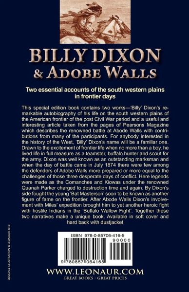 Life and Adventures of "Billy" Dixon by Billy Dixon The Battle of Adobe Walls by Edward Campbell Little Two essential accounts of the south western plains in frontier days This special edition book contains two works-'Billy' Dixon's remarkable autobiography of his life on the south western plains of the American frontier of the post Civil War period and a useful and interesting article taken from the pages of Pearsons Magazine which describes the renowned battle at Abode Walls with contributions from many of the participants. For anybody interested in the history of the West, 'Billy' Dixon's name will be a familiar one. Drawn to the excitement of frontier life when no more than a boy, he lived life in full measure as a teamster, buffalo hunter and scout for the army. Dixon was well known as an outstanding marksman and when the day of battle came in July 1874 there were few among the defenders of Adobe Walls more prepared or more equal to the challenges of those three desperate days of conflict. Here legends were made as the Comanches and Kiowas under the renowned Quanah Parker charged to destruction time and again. By Dixon's side fought the young 'Bat Masterson' soon to be known as another figure of fame on the frontier. After Abode Walls Dixon's involvement with Miles' expedition brought him to yet another heroic fight with hostile Indians in the 'Buffalo Wallow Fight'. Together these two narratives make a unique book. Available in soft cover and hard back with dustjacket.