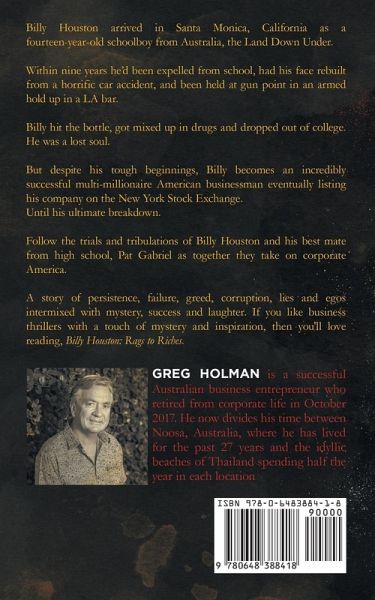 "A colorful journey involving exotic locations and larger than life personalities." Kathy Denver, The International Review of Books At fourteen years of age, Billy Houston arrived in Santa Monica, California and embraced the land of opportunity with both hands. This is his story. From clandestine raffles with his schoolmates, to creating two of the most dynamic franchise businesses in history, Billy's tale is one of triumphs and tribulations, interspersed with the wit and wisdom of a natural-born entrepreneur. Inspired by true events, Billy Houston Rags to Riches will take you on a journey unlike any you've read before - rooted firmly in reality, but with the twists and turns of a fast-paced financial thriller.