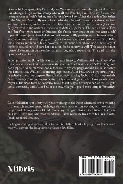 Born eight days apart, Billy Peal and Josie West were first cousins but a great deal more like siblings. Billy's mother Mary, whom all the West boys called "Baby Sister," was younger sister to Josie's father, one of a set of twin boys. After the death of his father in the Vietnam War, Billy was taken under the wings of his mother's three brothers and his maternal grandparents who all lived together on the family ranch. Josie and Billy referred to themselves as twins with different parents. The actual twins, Tim and Jim West, were rodeo enthusiasts, the first a steer wrestler and the latter a calf roper. Billy and Josie shared their enthusiasm and Billy participated in bronco riding, steer wrestling and calf roping while Josie became a serious barrel racer. Still, Billy was always a gentleman. Josie, however, could outride, outshoot, and outcuss any of the boys around her and gave her dad a run for his money as well. This was a constant source of contention between her parents, roughshod rodeo rider Tim and Jim the epitome of a perfect lady. A complication in Billy's life was his parents' history. William Peal and Mary West had married in secret. William was in the Corps of Cadets at Texas A&M College and not supposed to be married, Soon, though, Mary was pregnant and the relationship was hard to hide. William's conniving stepmother, Alice Peal, saw an opportunity and launched a smear campaign to discredit the couple, casting doubt and shame upon their "secret marriage," and trying to convince Billy's paternal grandfather, bank president and mayor of the small town of Westerly, Texas, to cut Billy out of any inheritance. Life gets pretty interesting with Alice Peal at the head of anything and everything in Westerley.
