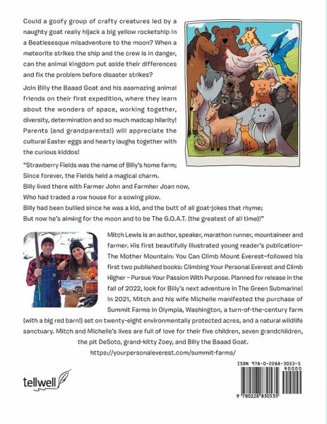 Could a goofy group of crafty creatures led by a naughty goat really hijack a big yellow rocketship in a Beatlesesque misadventure to the moon? When a meteorite strikes the ship and the crew is in danger, can the animal kingdom put aside their differences and fix the problem before disaster strikes? Join Billy the Baaad Goat and his aaamazing animal friends on their first expedition, where they learn about the wonders of space, working together, diversity, determination and so much madcap hilarity! Parents (and grandparents!) will appreciate the cultural Easter eggs and hearty laughs together with the curious kiddos! "Strawberry Fields was the name of Billy's home farm; Since forever, the Fields held a magical charm. Billy lived there with Farmer John and Farmher Joan now, Who had traded a row house for a sowing plow. Billy had been bullied since he was a kid, and the butt of all goat-jokes that rhyme; But now he's aiming for the moon and to be The G.O.A.T. (the greatest of all time)!"