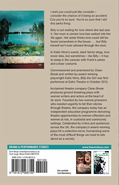 I wish you could just like consider - consider the chance of it being an accident. 'Cos you're so sure. You're so sure that I did this awful thing. Billy is out waiting for love where she last saw it. Her mum is certain love has walked into her life again. Her sister thinks love could still be found somewhere in the house . . . but Billy herself isn't even allowed through the door. In Katie Hims's sweet, stark family elegy, love never dies, but sometimes - like Billy - it has to sleep in the caravan with Frank's ashes and a bear costume. Billy the Girl is a sharp, yet gentle, look at a fractured family dealing with a lifetime of mistrust.