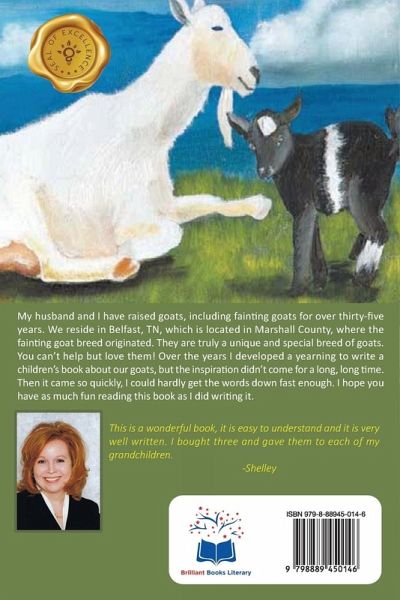 My husband and I have raised goats, including fainting goats for over thirty-five years. We reside in Belfast, TN, which is located in Marshall County, where the fainting goat breed originated. They are truly a unique and special breed of goats. You can't help but love them! Over the years I developed a yearning to write a children's book about our goats, but the inspiration didn't come for a long, long time. Then it came so quickly, I could hardly get the words down fast enough. I hope you have as much fun reading this book as I did wring it.