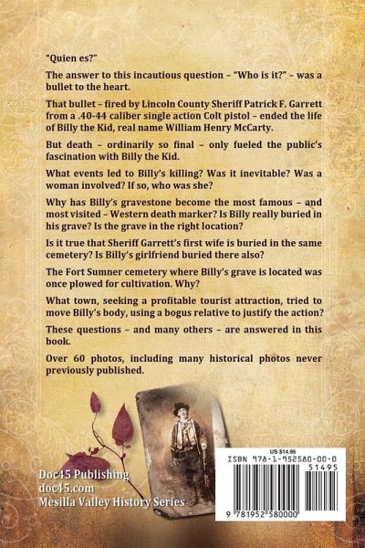 "Quien es?" The answer to this incautious question - "Who is it?" - was a bullet to the heart. That bullet -- fired by Lincoln County Sheriff Patrick F. Garrett from a .40-44 caliber single action Colt pistol -- ended the life of Billy the Kid, real name William Henry McCarty. But death - ordinarily so final - only fueled the public's fascination with Billy the Kid. What events led to Billy's killing? Was it inevitable? Was a woman involved? If so, who was she? Why has Billy's gravestone become the most famous - and most visited - Western death marker? Is Billy really buried in his grave? Is the grave in the right location? Is it true that Pat Garrett's first wife is buried in the same cemetery? Is Billy's girlfriend buried there also? The Fort Sumner cemetery where Billy's grave is located was once plowed for cultivation. Why? What town, seeking a profitable tourist attraction, tried to move Billy's body, using a phony relative to justify the action? These questions -- and many others - are answered in this book. Over 60 photos, including many historical photos never previously published.